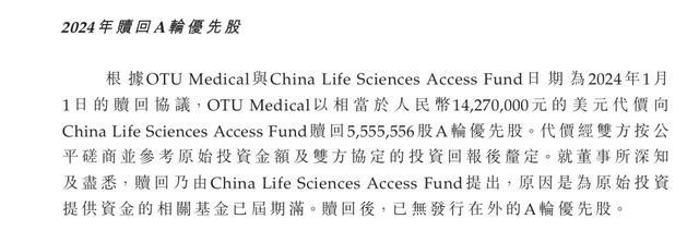 但在2024年和2025年,OTU Medicalf分别回购了China Life Science、Guo Ying所持股份,对价分别为1427万元人民币、5400美元,两家投资机构就此退出股东行列。