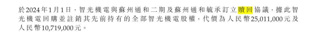 值得关注的是,2018年,公司的全资附属子公司智光机电获得苏州通和二期、苏州通和毓承两家投资机构的投资,两者投资2666.7万元获得10%股权,但2024年1月1日,两者行使了赎回权,价格为3573万元,退出了投资。
